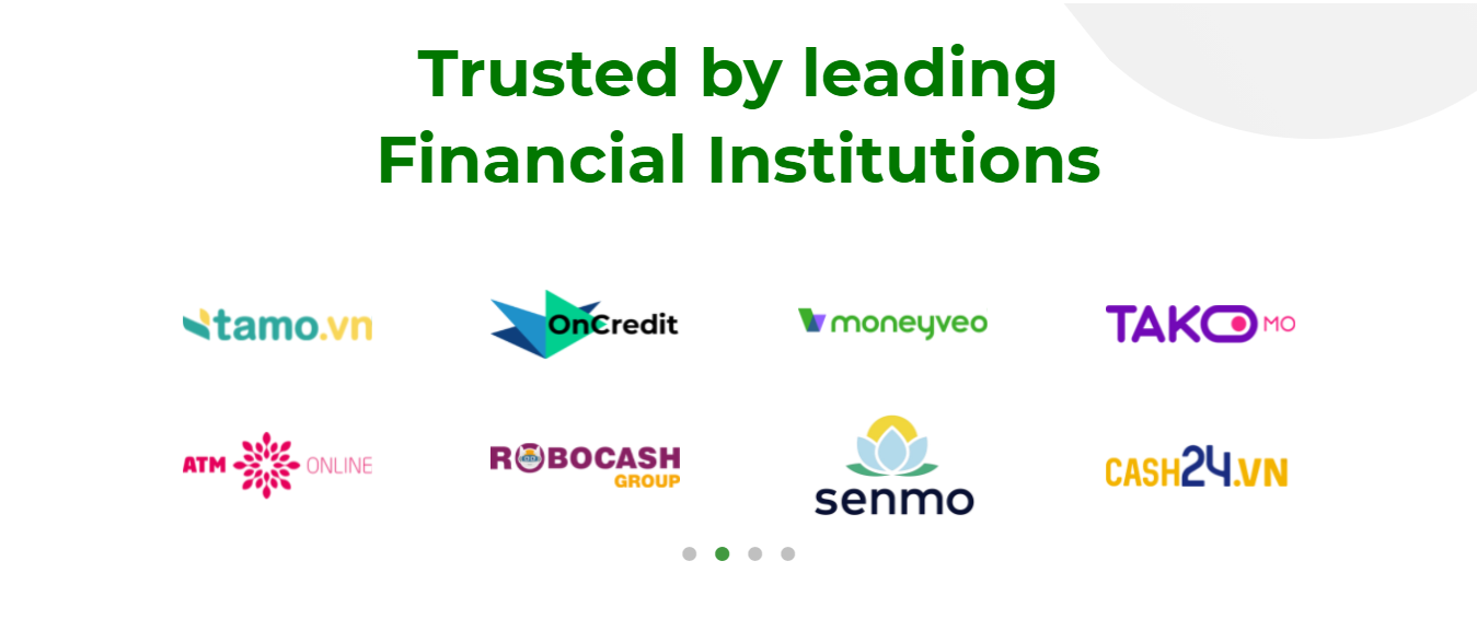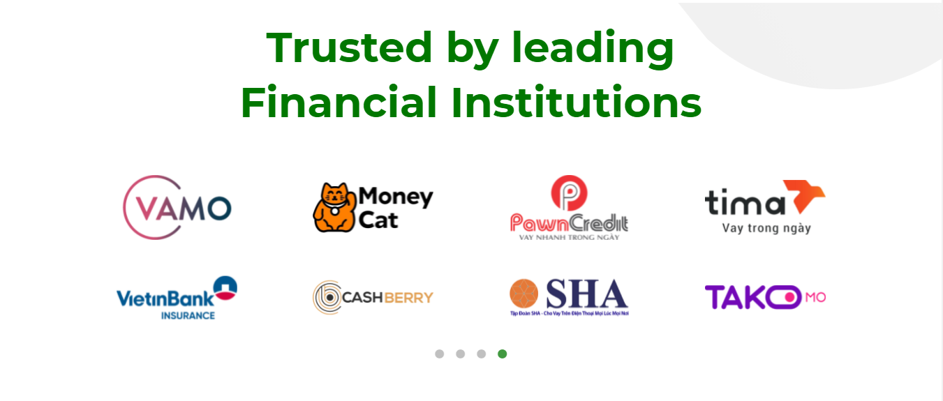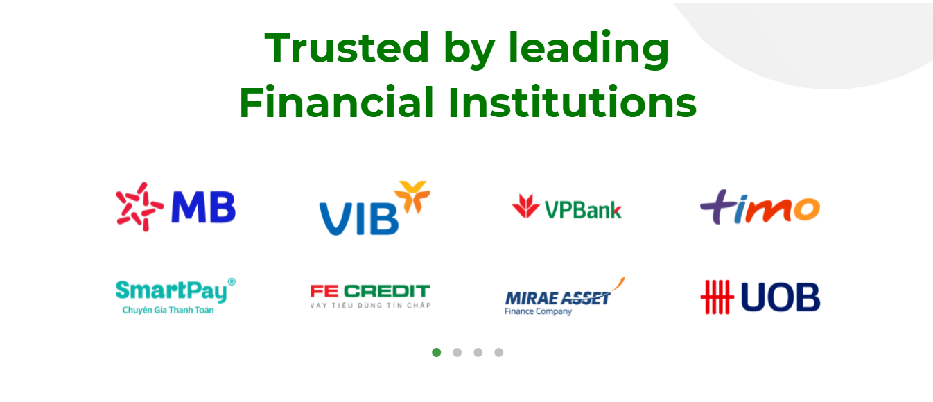 Chúng tôi cung cấp cho đối tác khách hàng thực có nhu cầu sử dụng sản phẩm Tài chính của các Tổ chức Tài chính, Ngân hàng, đối tác Fintech. Đặc biệt, các Ngân hàng đã ứng dụng công nghệ eKYC để khách hàng có thể mở tài khoản thanh toán trực tuyến, ….